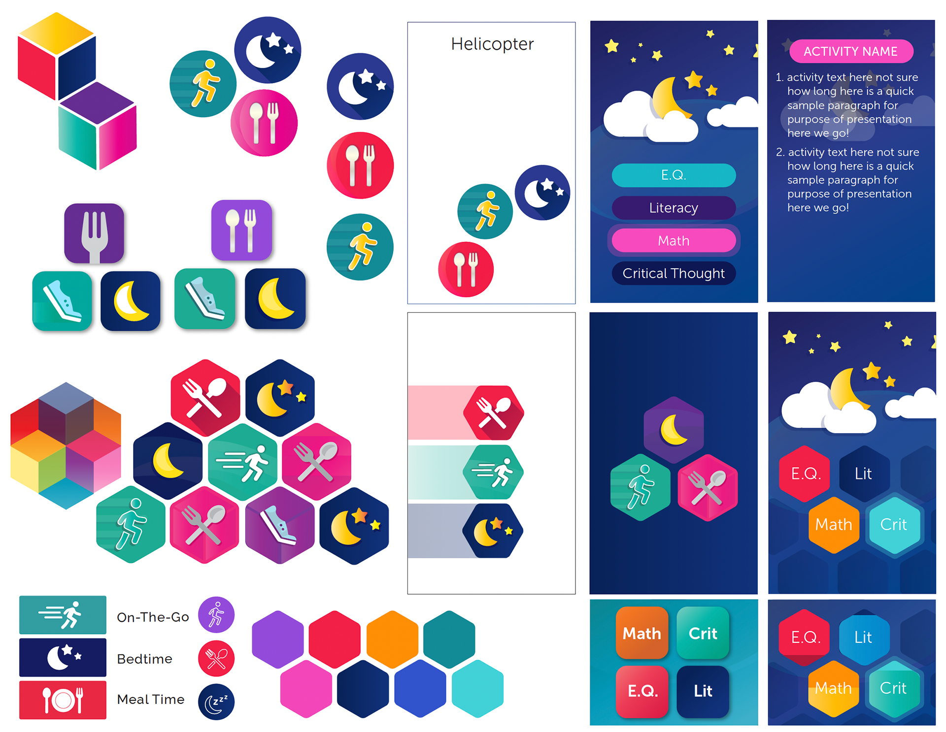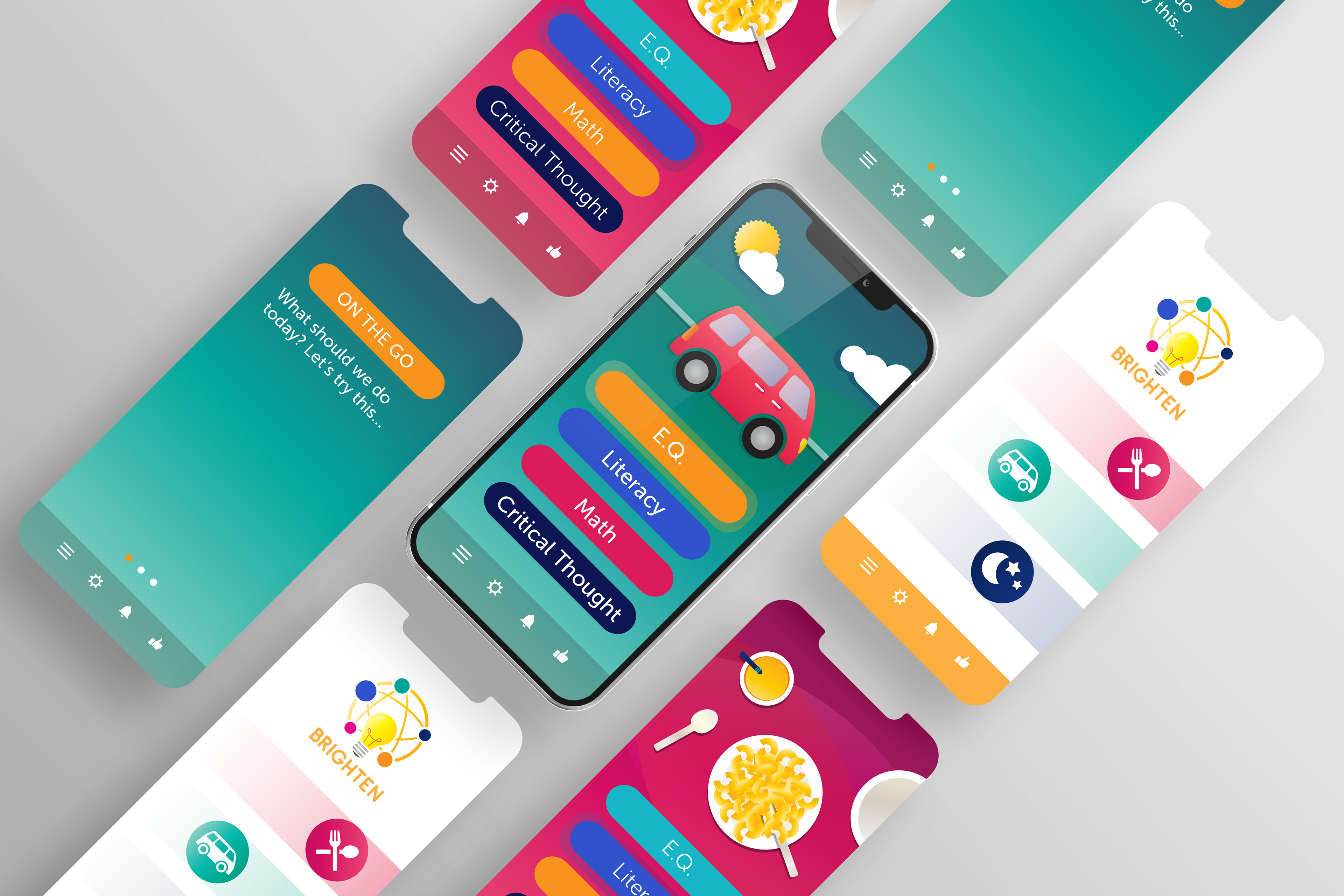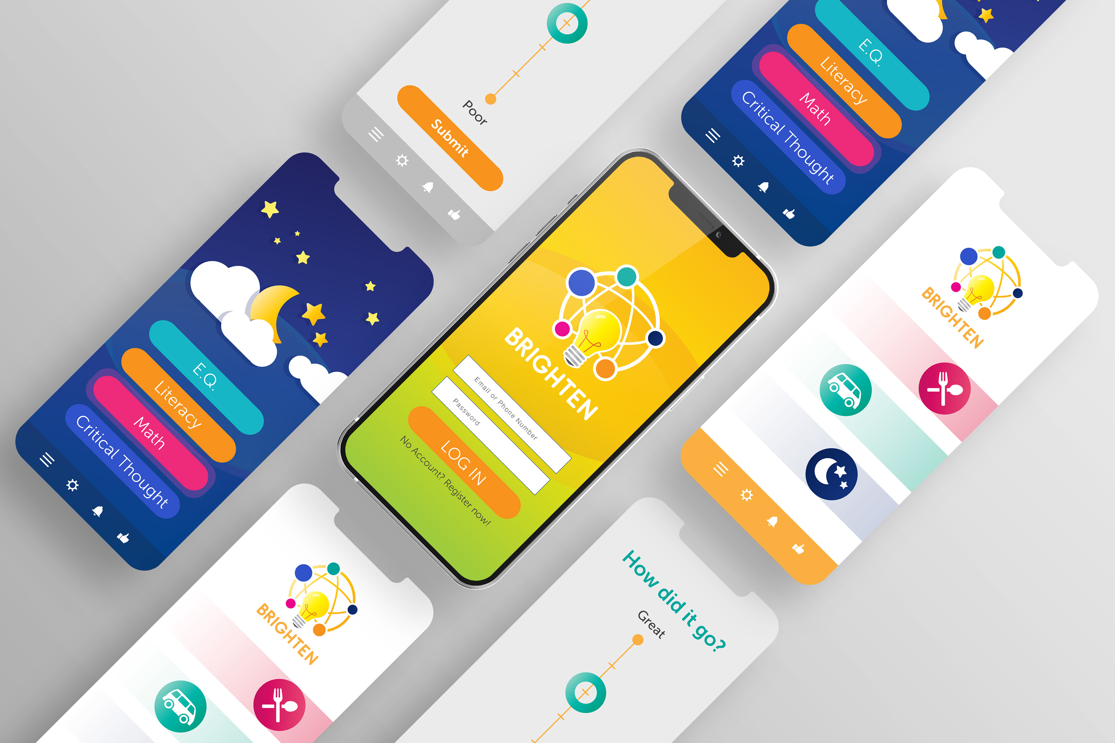 A small selection of UI/App design work including a redesign for Zorts Sports mobile app, and mood boarding and design for the overall feel and design of a new educational app concept, Brighten.